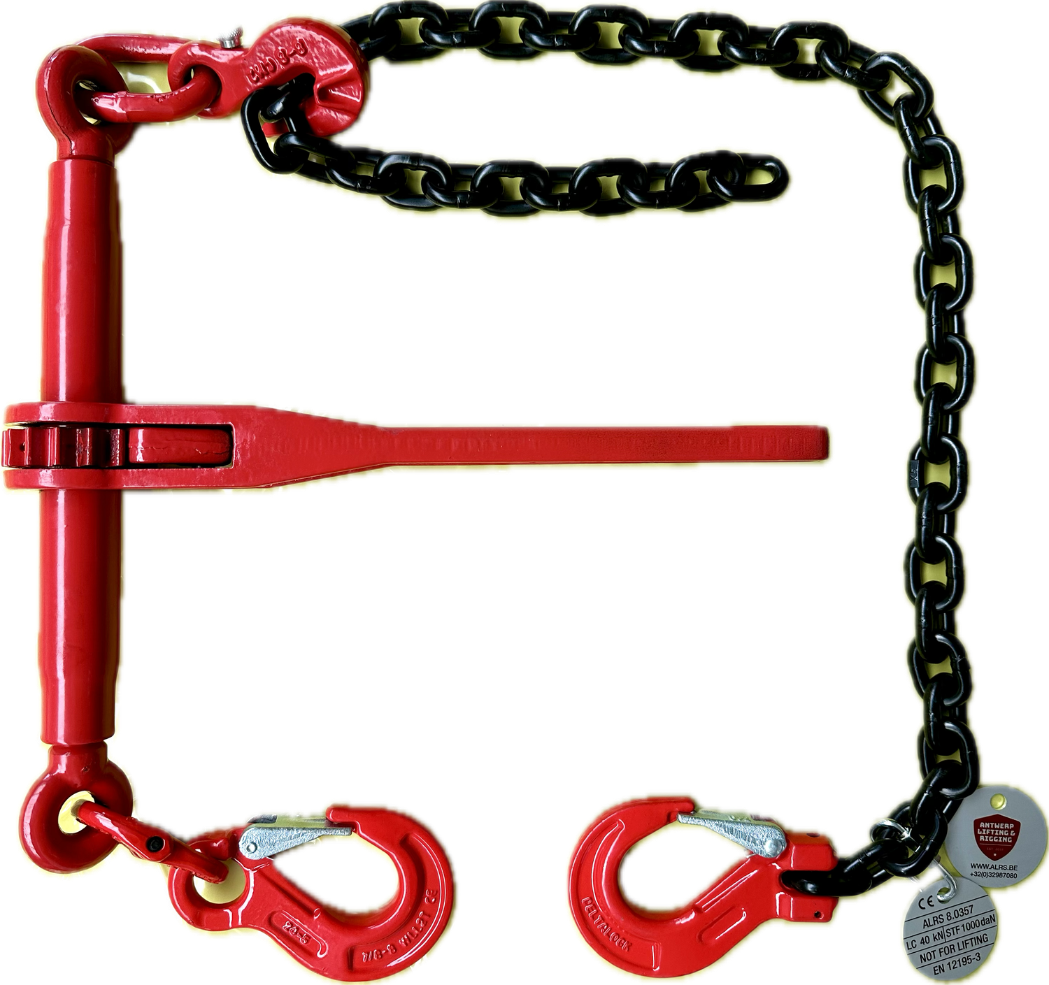 1x Ketting met 1 klephaak + 1x ladingspanner met inkort haak en klephaak voor het afspannen van zware goederen.